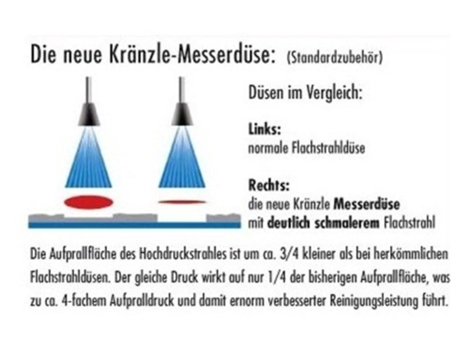 Messerdüse (M): Die Aufprallfläche des Hochdruckstrahles ist um ca. 3/4 kleiner als bei herkömmlichen Flachstrahldüsen. Der gleiche Druck wirkt auf nur 1/4 der bisherigen Aufprallfläche, was zu ca. 4-fachem Aufpralldruck und damit enorm verbesserter Reinigungsleistung führt.
